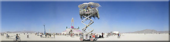 | Folding-Time Home Movies Online 2005 2003-2004 2002 Folding-Time DVDs Order 2004/03/02 DVDs Folding-Time 2005 Folding 2005 Event Timeline Installation Folding-Time 2004 Folding 2004 Installation Folding-Time 2003 Folding 2003 Installation Folding-Time 2002 Art Installation Aug 12 Aug 13 Aug 14 Aug 30 Sep 01 Sep 12 Technology Time Navigators Robert Henrikson Timothy Childs Panoramic Photos Burning Man 2007 Burning Man 2006 Burning Man 2005 Burning Man 2004 Burning Man 2003 Panmagic.com Panmagic Videos Otter Clan The Burning Man Temple Burns | Folding-Time 2005A Timewave Panorama of Burning Man Burning Man Festival, Aug. 29 thru Sep. 6, 2005. Theme is "Psyche". The Folding-Time Camera Tower was again located 4/5 the way from Center Camp to The Man. Aug. 14: Folding-Time tower installation Folding-Time Scissor Lift Video Platform
